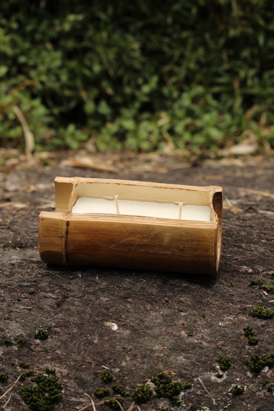 Feita com cera de soja vegetal e colmos de bambu reaproveitados da construção, esta vela carrega a beleza do que nasce do cuidado com a terra.